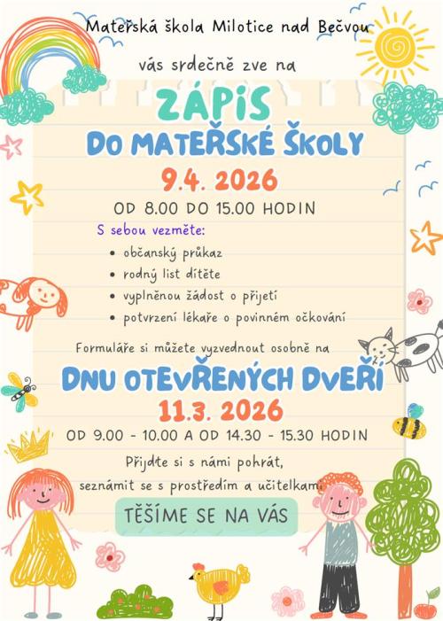 Informujeme, že na odkazech níže jsou uveřejněny dokumenty potřebné k zápisu do Mateřské školy Milotice nad Bečvou: