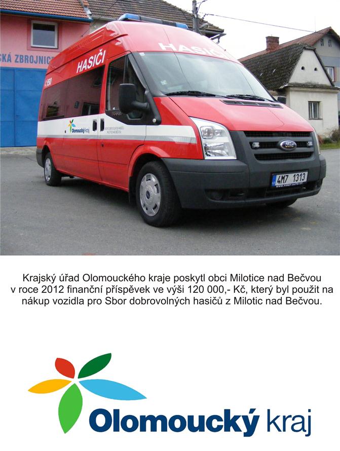 Krajský úřad Olomouckého kraje poskytl obci Milotice nad Bečvou finanční příspěvek ve výši 120 000,- Kč, který byl použit na nákup vozidla pro Sbor dobrovolných hasičů z Milotic nad Bečvou. Fotografie poskytl Jiří Plánka.